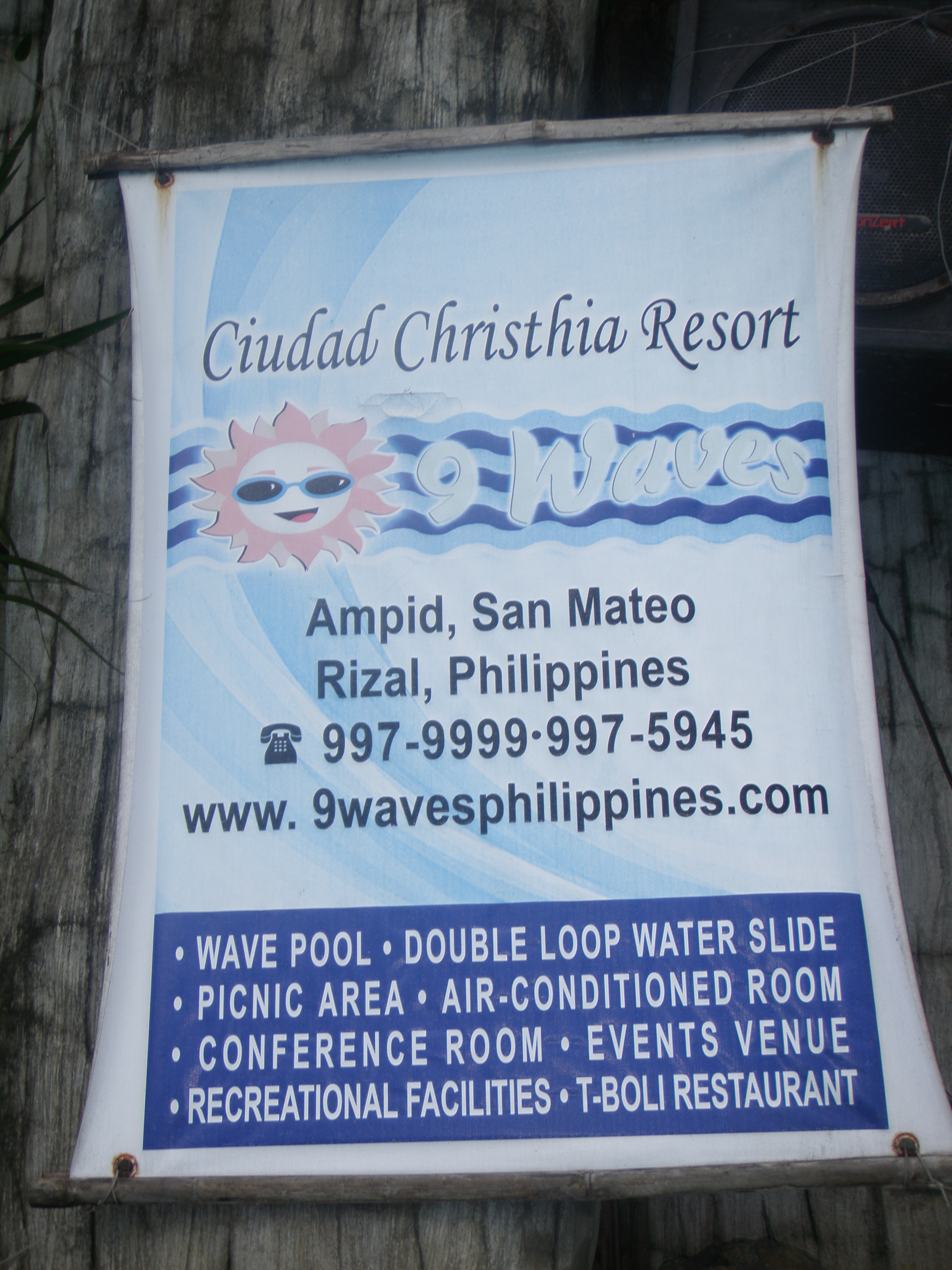 Ilang liko pa at maingat na pag-maniobra ng manibela, narating ko ng muli ang Ciudad Christia Resort. Kitang kita ang sign nito sa labas ng Carrielands Subdivision. Ang palatandaan ko lang ay sa tapat ito ng Tropical Hut at Mercury Drug. Kilala rin ito sa tawag na nine (9) waves resort. Meron itong tatlong klase ng pool – adult pool (3 to 6ft), kiddie pool (2 to 4 ft), wave pool (0 to 6ft). May mga picnic huts, souvenir shop, restaurant, airconditioned rooms, conference rooms, pergola hall (events place), team building facilities, mini organic garden, billiards, table tennis at basket ball court.