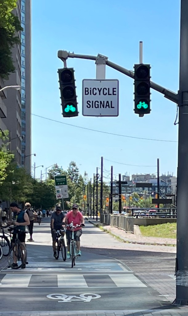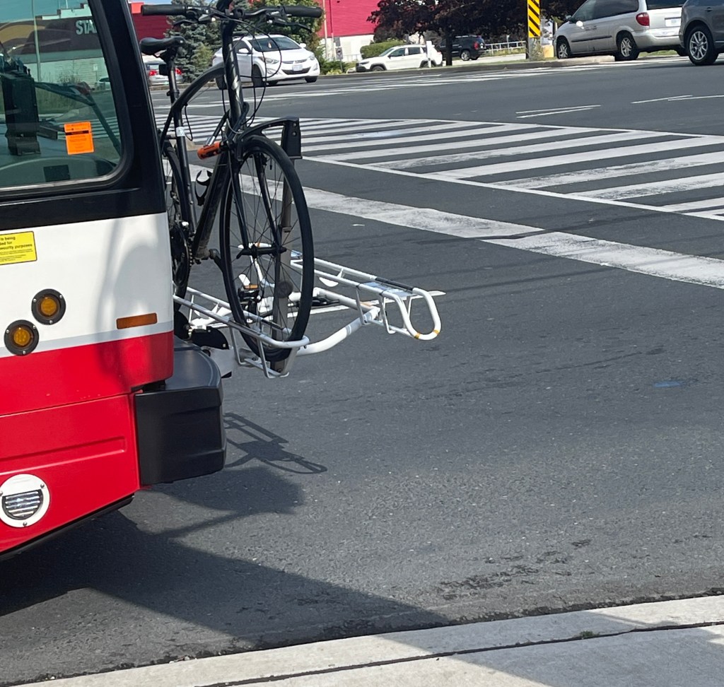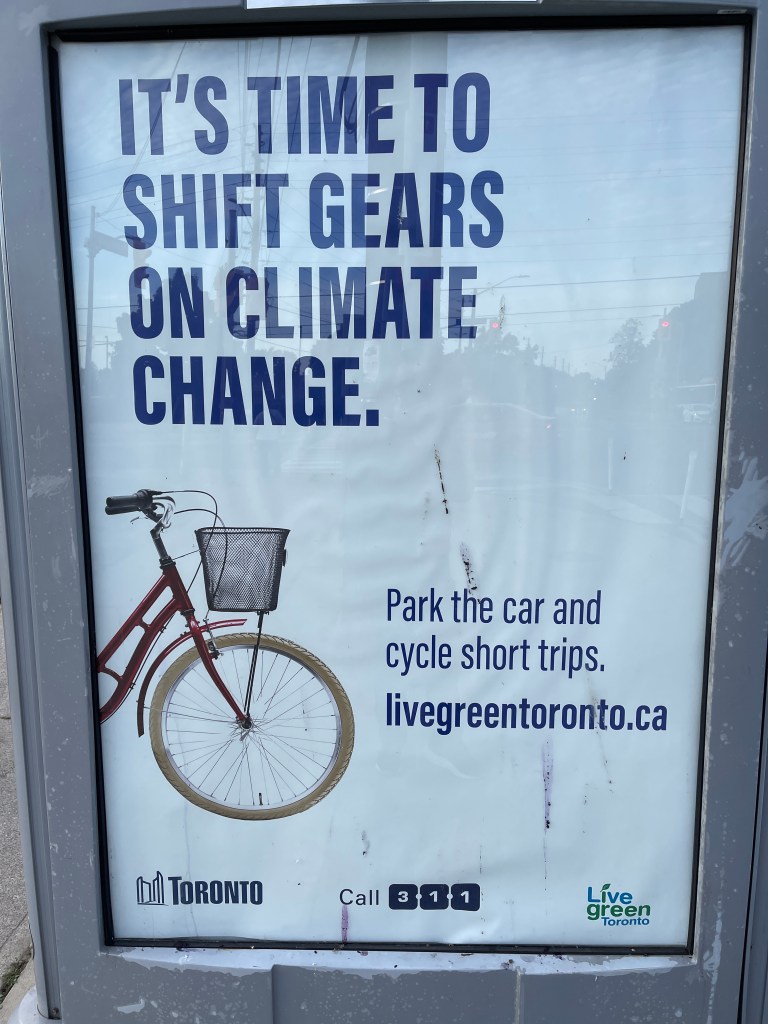 Masasabi ko nga na-ini encourage ang biking dito sa Toronto, Canada. Kahit ang mga bus rito ay may lagayan ng bisikleta sa harap. Meron rin sign akong nakita sa isang bus stop dito sa Toronto na nag-papaalala na gumamit na lang ng bisekleta para sa climate change.